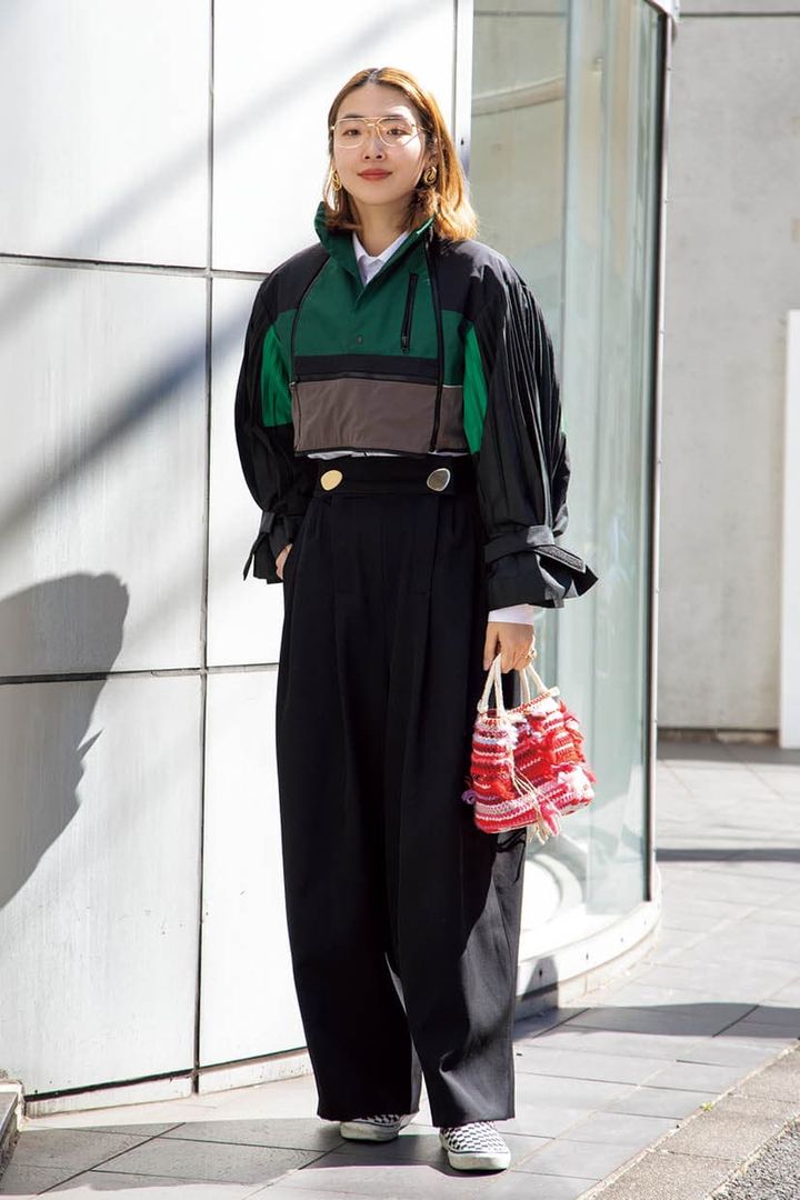 FACETASMのブルゾン、HARUNOBU MURATAのパンツ、Bud.のバッグ、VANSのスニーカー、DIORのピアス、NIKONの眼鏡は本人私物