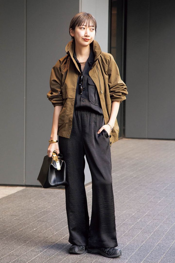 スタイリング面ではもちろん、気温の寒暖差が激しいこの時季に重宝する便利なブルゾン。キレイめアイテムとコーデするのが、やっぱり大人の基本のよう。