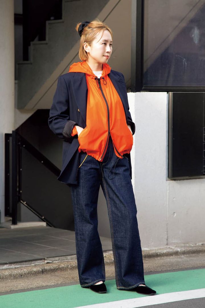 「鮮やかなオレンジのブルゾンは、オーセンティックなジャケットと重ねてトラッドな雰囲気に。スポーティなアイテムを取り入れるときはコーデに1点だけにすることが多いです」