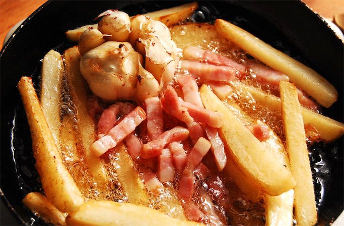 人気のお料理系YouTubeチャンネル『くまの限界食堂』で、興味深い「ジャーマンポテトフライ」を紹介していました。スティック状にカットしたじゃがいもと厚切りベーコンを油で揚げるところまでは想定内ですが…。なんと、にんにくを皮付きのまま、丸ごと1房一緒に揚げてしまうのです!油で揚げたじゃがいもとにんにく2種類の“ほくほく“と、ベーコンの“カリカリ“。この魅惑的なカリほくループは、沼落ち確定だとか。