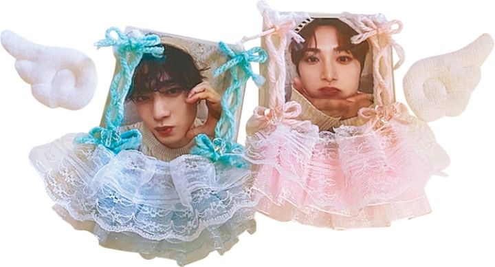 100円ショップや手芸用品店で買ったレースや毛糸、パーツを接着剤で硬質ケースに貼りつけて、そこにトレカを入れています!」