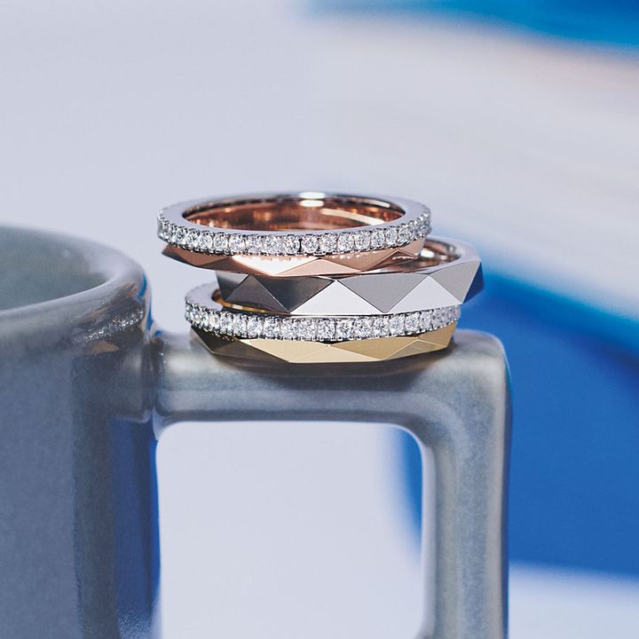 ダイヤモンドの立体的なファセットにインスパイアされたコレクション。他に類を見ない眩い輝きを放つリングは、キャリアを積み上げるように、ひとつずつ大切に重ねたい。