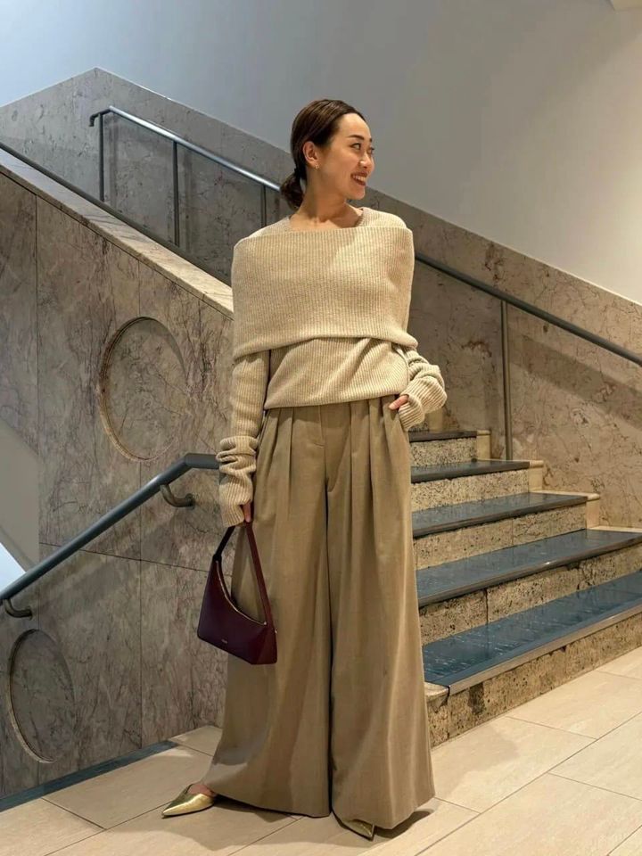柔らかなハイゲージニットに合わせるのは、ハリ感のあるワイドパンツ。素材感に緩急をつけることで、のっぺりしないベージュのワントーンコーデが完成します! アクセサリーや眼鏡も肌なじみのいい華奢なものを選ぶとさらに統一感が出て◎。
