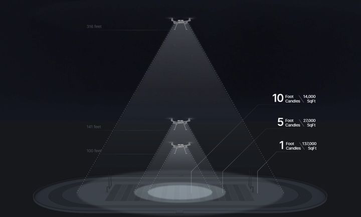 60度のスポットライトを利用しており、ドローンが上昇するにつれて照明範囲が広くなり、強度は弱まります。