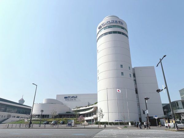 こちらが福岡サンパレス ホテル&ホールです。灯台のような円柱の建物が印象的です。ホテルの入り口は円柱の建物の右側です。