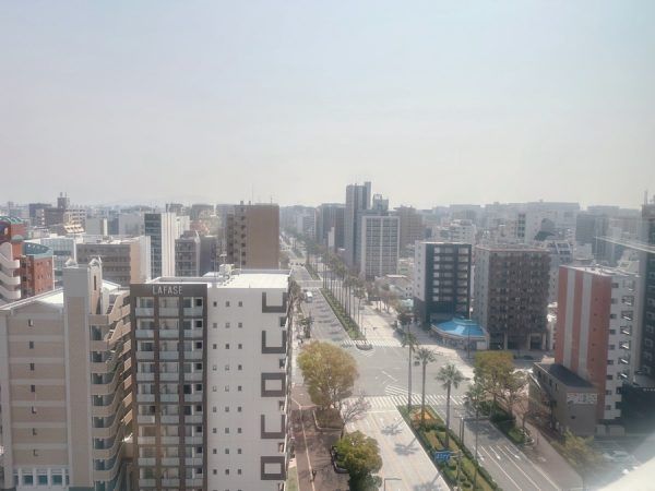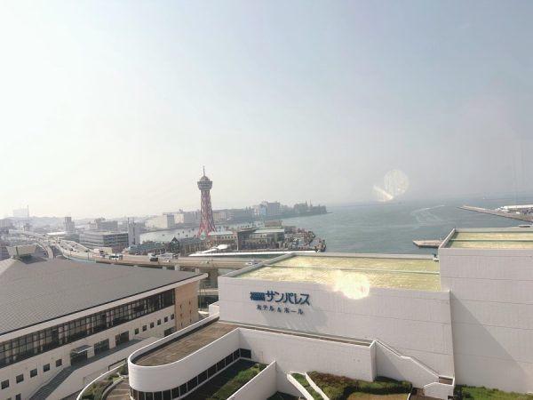 エレベーターを降りてすぐの景色がこちら!!博多湾と博多ポートタワーが一望できる素晴らしいロケーションです!この日は花粉と黄砂があったため少しかすんでいますが、クリアに見える日は玄海島まで見えるそうです。