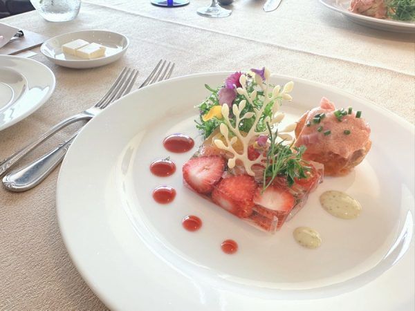 苺とカラフルトマト、サーモン入り白ワインゼリーのテリーヌ&おつまみとなるタラモサラダ 鮮魚のクリームスープ サフラン風味 真鯛と香味野菜の香り広がるブイヤベース スフレチーズケーキとストロベリーのグラス パン コーヒーまたは紅茶