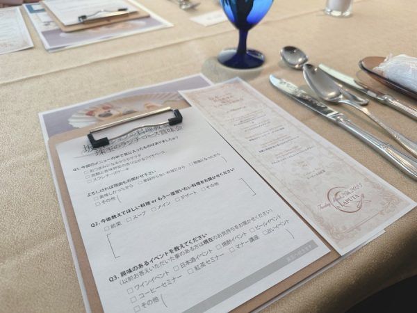 食事をしていると、シェフが直接テーブルを回ってくださいます。生徒さんとゆっくりお話ししながら味の感想や、改めて質問などを受けていらっしゃいました。みなさんシェフとお話ししながら盛り上がっていたので、ここでのお写真は控えさせていただきました。 「2か月に一度の教室ですと、メニューを考案されるのも大変かと思いますが、メニューを考えるときに大切にされていることはありますか?」と尋ねました。 「毎回アンケートにはしっかり目を通すので、生徒さんからのリクエストに応えられるようにしています。また、工程や材料を極力手に入れやすいもので作ることでみなさんに自宅で作ってほしいと思っています。季節感や今の時代にあったものを提案できるように常に考えています。」とのこと。お忙しい中でも常に生徒さんに真摯に向き合い、誠実なお人柄にわたしもファンになってしまいました。毎回満席なのも納得です!