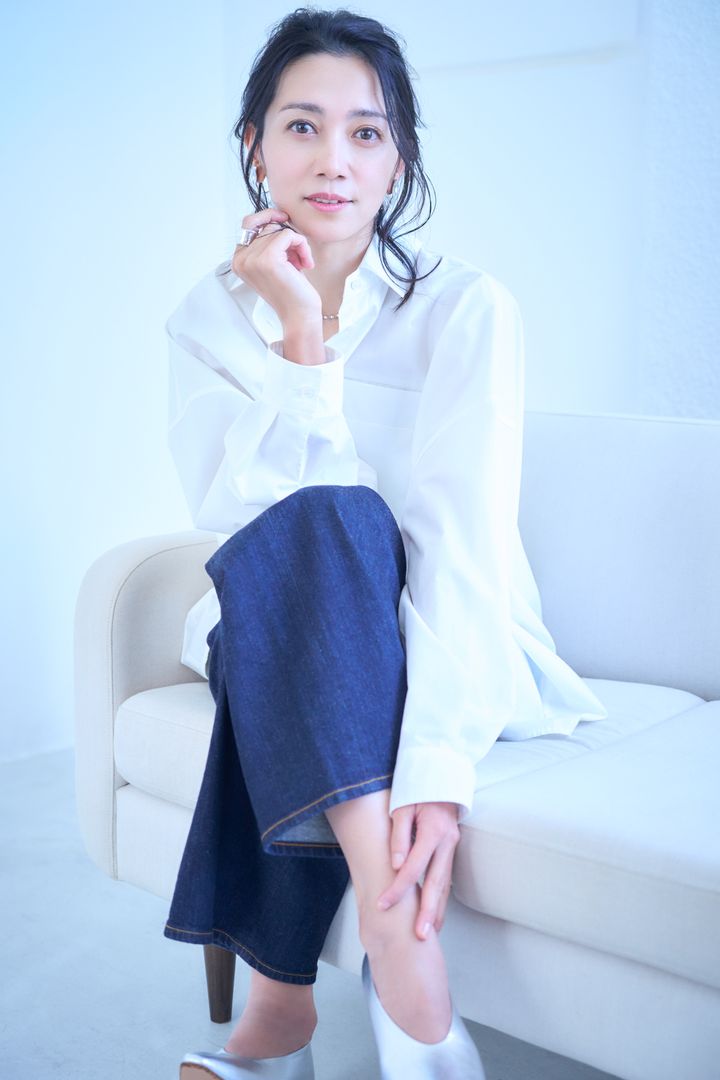 シャツ¥27,500(ハウント/ハウント代官山)デニムパンツ¥23,100(レッドカード トーキョー/ゲストリスト)パンプス¥17,050(ダイアナ/ダイアナ 銀座本店)ネックレス¥50,600(マリハ)イヤリング¥4,950(クードル/MIKIRI)リング¥25,960(バルブス/ZUTTOHOLIC)