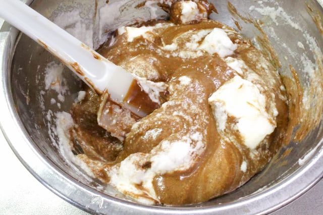 2回目は底から大きく混ぜて切るようなイメージで、メレンゲを潰さないようにやさしく混ぜ合わせます。