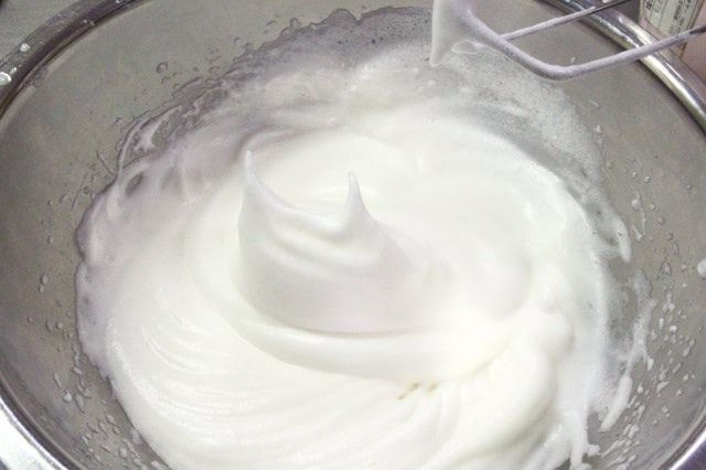 画像は3回目、最後の砂糖を入れたところです。すでに卵白がきめ細かくなっていますが、最後の砂糖を加えて角が立つまで、1分ほど泡立てました。