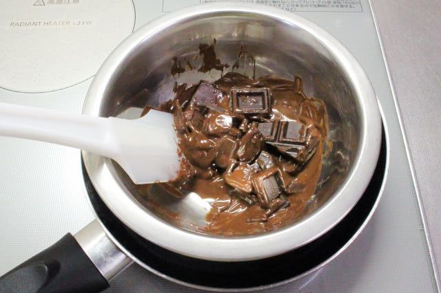 チョコレートの温度が高くなり過ぎると、もそもそと固まるので50℃~60℃のお湯で湯せんするのがいいそうです。