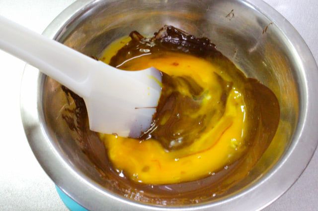 最後は、メレンゲのボウルにチョコレートを移して、混ぜ合わせます。上の画像のチョコレートは、すでにメレンゲを2回加えて混ぜ合わせた状態です。色が少し明るくなり、とろっとしていますよ。