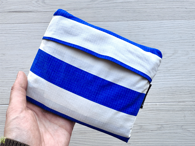 ボタンやファスナー、金具などは一切使われていないので、収納ポケットにたたんで入れればこの通りコンパクトになります。誰でも簡単に使えて軽いという点から、シニアにも人気なのだとか。