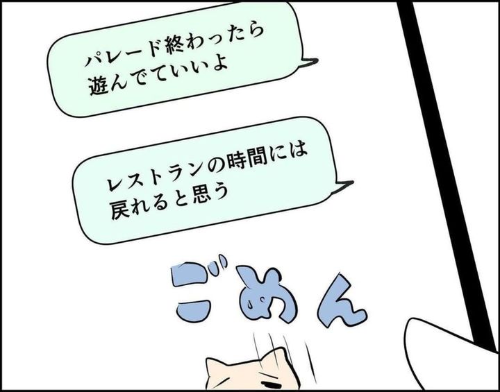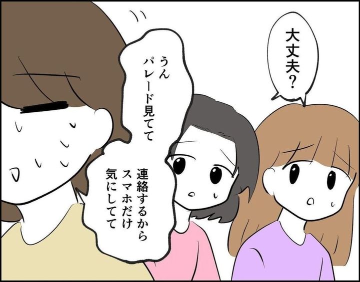 その後、無事に合流した3人はテーマパークへ入園し、パレードを見るための場所取りをします。パレードまでの2時間、軽食をとったり、おしゃべりしたりと、待ち時間を楽しく過ごしていました。ところが、徹夜明けのセミさんの体に異変があらわれます…。