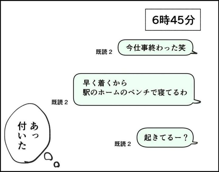 激務で徹明けのセミさん…。何とかテーマパークの最寄り駅まで向かいました。友人に連絡をしましたが、既読がつきません。やっと既読がついたと思ったら「今起きた」というメッセージが…。