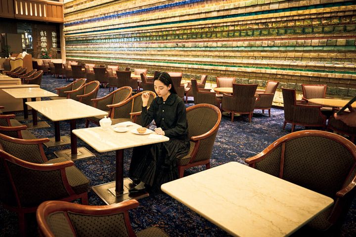 2025年11月に開業135周年を迎える『帝国ホテル 東京』へ。本館1階の『ランデブーラウンジ』に着いた途端、約7600個ものガラスブロックが織りなす多田美波の大作『黎明(光の壁)』に心奪われた。特別な場所に羽織ったのは〈タオ〉のシックなカーディガン。黒一色のなかに、手編みの襟に施された花柄が浮かび上がり、たまらなく愛らしい。カーディガン¥67,100、スカート¥61,600(ともにタオ/コム デ ギャルソン 03−3486−7611) シューズ¥35,200(A.P.C./アー・ペー・セー カスタマーサービス 0120−500−990) その他スタイリスト私物