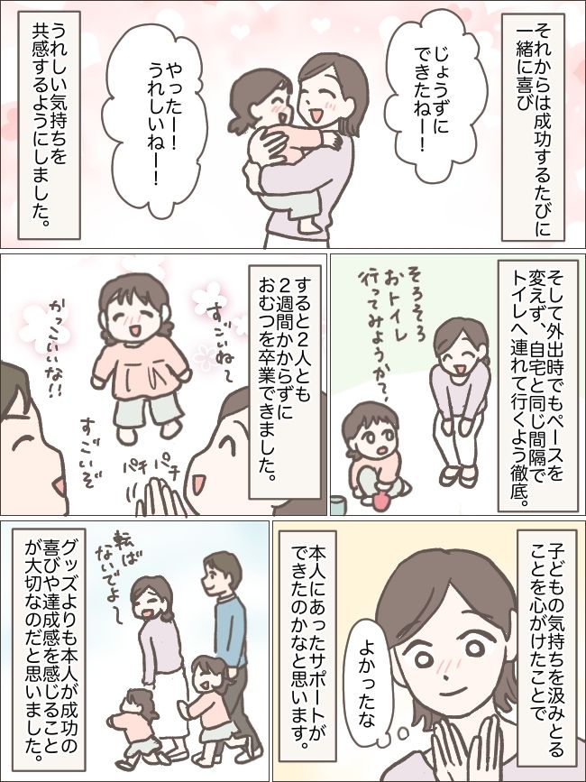こんな感じでわが家のトイレトレーニングは2週間かからずに完了しました。トイトレは、子どもがおしっこやうんちを漏らしたときに不快に感じたり、トイレやおまるでできたときに成功の喜びをたくさん感じることが大切だと感じました。以前はマニュアルばかりを参考にしすぎていましたが、子どもの気持ちを汲みとって子どもにあったサポートをしてよかったなと思っています。トイレトレーニングは体や心の発育も関係しているといいますが、開始年齢は2人とも2歳半。開始した時期も、2人によいタイミングだったのかもしれません。