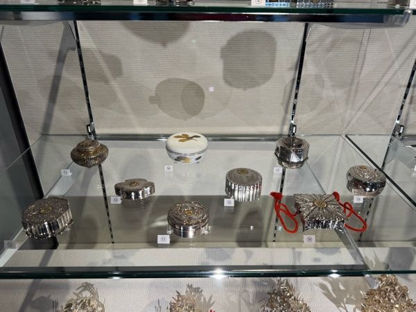 緻密な細工でつくられた銀製のボンボニエール。廃刀令で職を失った伝統工芸技術を継承・保護し、海外へ宣伝する役割も果たしています。皇室ではこの慣習を現在も継続しており、海外ではボンボニエールは日本皇室特有の工芸品として認識されているようです。