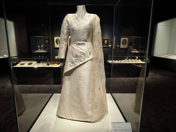 展覧会場内にはローブ・モンタント(上皇后陛下所用)が展示されていました。洋装のドレスでありながら、伝統的織物「佐賀錦」が用いられており、日本固有の伝統技術の重要さとその美を広く発信したいと願う、皇室の意識の表れといえるでしょう。
