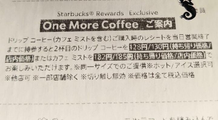 1杯目の会計をWeb登録済みのスターバックス カードで支払うと、2杯目のドリップ コーヒーは128円(持ち帰り)・130円(店内価格)、カフェ ミストは182円(持ち帰り)、185円(店内価格)で飲むことができます。