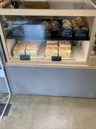 木のショーケースの中に入っているのは、カヌレ280円とプレーンシフォン260円、クランベリーホワイトチョコシフォン290円、りんごタルト300円、全粒粉スコーン210円、フィナンシェ210円が販売していました。