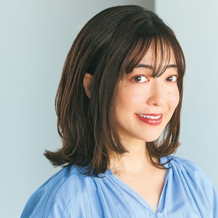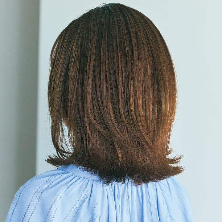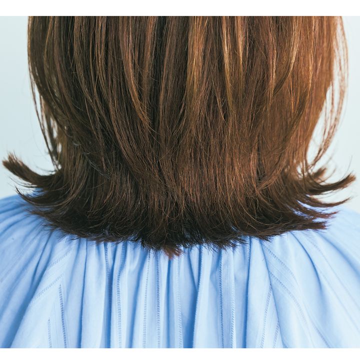 肩でハネる毛先はアウトラインが残るようにパツンとカット。スカスカしないので、ツヤ感が出るだけでなく毛量もたっぷりと見えます。