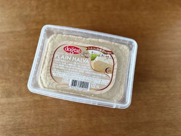 香ばしいごまの風味がおいしい中東を代表する伝統菓子の「ハルヴァ」。その存在を知らなかった私は、ジャムやパンにぬるアイテムの並ぶ棚にあったハルヴァを「ごま風味のパンにぬるペースト」だと思って購入。しかしよく見たら「お菓子」とあるし、そもそもパンに「塗る」固さではありませんでした。包丁などで好みの厚さにカットして食べるものだそうです。