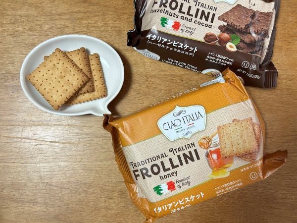 固めが美味しい「イタリアンビスケット」は「はちみつ」、「ヘーゼルナッツ&ココア」、「クランベリー&セサミ」の3種の味があり、わが家ではシンプルな「はちみつ」が一番人気。子供が小さなころによく作っていたシンプルなオイルクッキーによく似ているからか、素朴で懐かしい味はなんだか落ち着くそうです。保存料・着色料・卵・乳製品不使用の優しい味のビスケットは10枚入りの袋が2袋入っています。20枚で約150円とはリーズナブル!