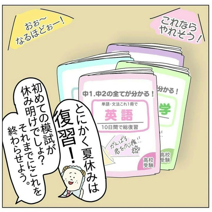 中学3年生となったリコさん。今の自分の偏差値よりもだいぶ高い高校を志望します。塾には通わず、自宅での受験勉強をスタート。夏休みは今までの復習にあて、購入したドリルをやり終えます。
