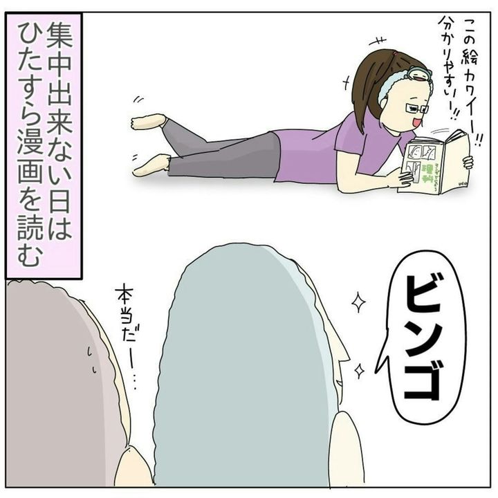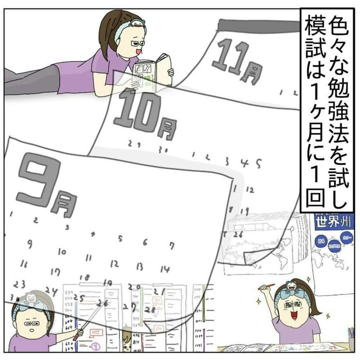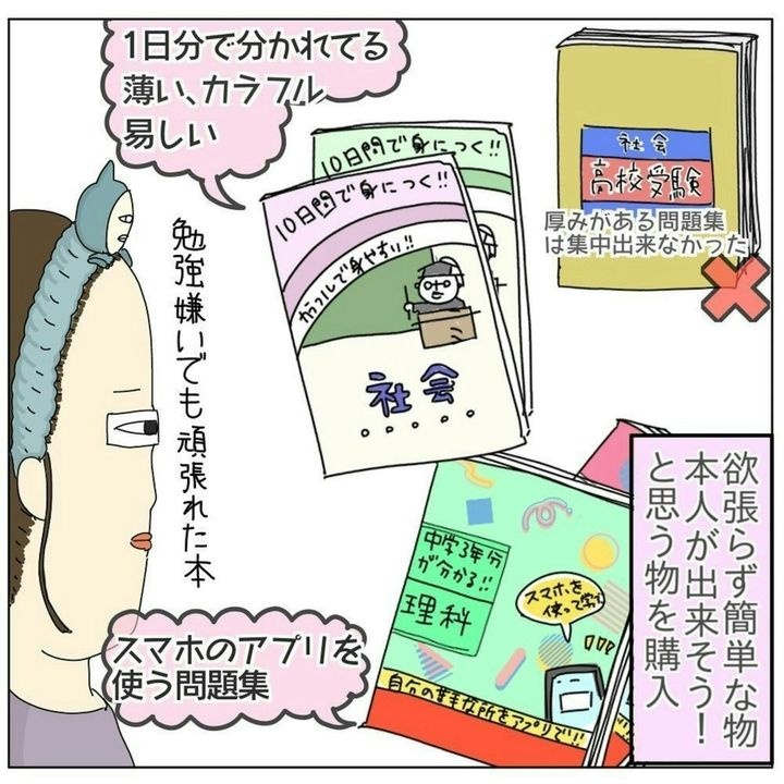 模試の結果を受け、やる気に火がついたリコさん。ですが、元々勉強ぎらいなため、集中力が続かない日も。うすいドリルやアプリを駆使し、何とか机に向かいます。どうしても集中できない日は、学習まんがを購入したところ、これがヒット!楽しく勉強しながら、息抜きもでき、一石二鳥だったようですね。