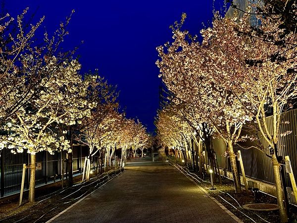 全長約140メートルの並木道に、八重桜を中心に、26品種107本の桜の木が植えられています。 夜にはライトアップされ、夜桜も楽しめます。