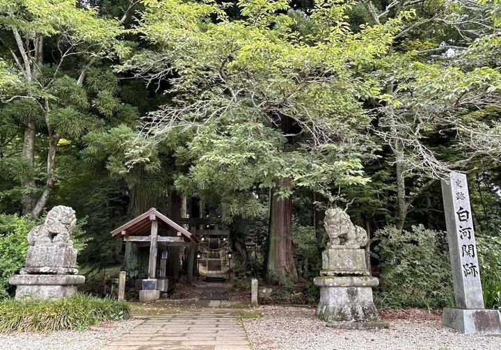 白河神社の境内には、寛政12年(1800)に白河藩主・松平定信が建造した「古関蹟」の碑が立っているほか、隣接する「白河関の森公園」には、松尾芭蕉、曽良の像があります。