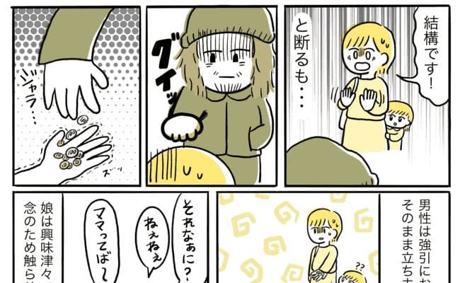 少しすると、50代くらいのホームレスのような風貌の見知らぬ男性が近づいてきました。ジロジロ見ないようにしていると、急に300円ほどの小銭をじゃらじゃらっと無言で娘へ差し出してきたのです。