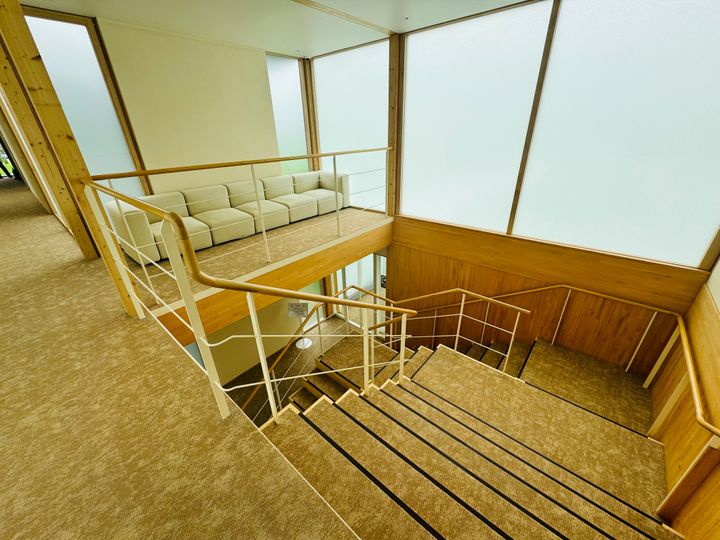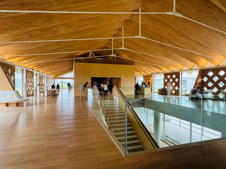 まずは広々としたロビー。1階に車寄せがあり、2階へ上がります。天井も高く、大きな窓も非常に開放的です。両サイドの格子柄のデザインから光が差し込むデザインもとても素敵。そう、スイデンテラスの建築デザインを担当したのは、世界的建築家の坂茂氏なのです。