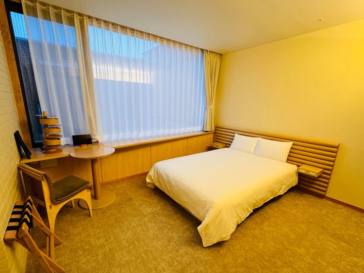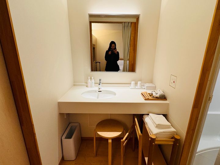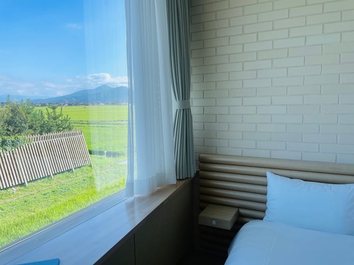 今回は基本的なダブルベットルームのご紹介ですが、お部屋には独立したトイレと、広々とした洗面台、そして湯船付きのお風呂もあります。天気の良い日の水田ビューのお部屋は、ワーケーションで利用してもお仕事の気分転換に良さそうです。