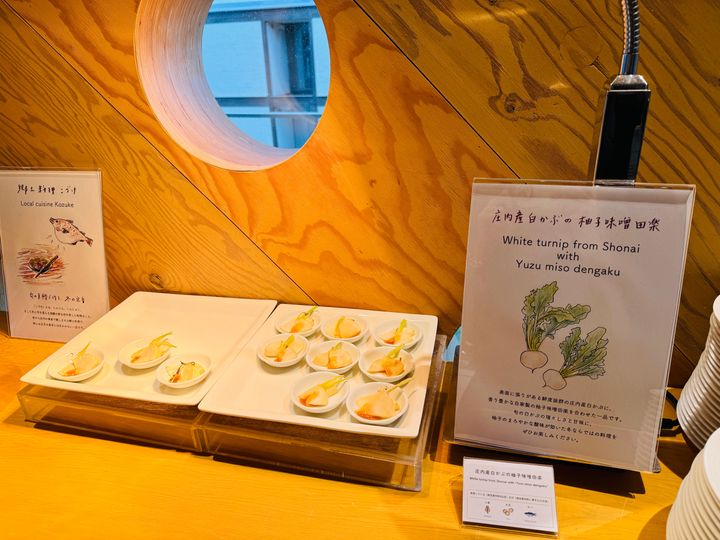 朝はお楽しみの朝食ブッフェを「MOON TERRASSE」にて頂けます。スイデンテラスといえば、こだわりの和朝食ブッフェを楽しみに宿泊される方もとても多いのです。それもそのはず、地域の農家さんと連携したこだわりの食材、季節を感じる庄内の郷土料理、1品1品のクオリティが本当に高く、思わず食べ過ぎてしまいます。ここで出会った珍しいお野菜や、美味しい調味料は、産地直売所で見つけてぜひ旅のお土産にしてくださいね。