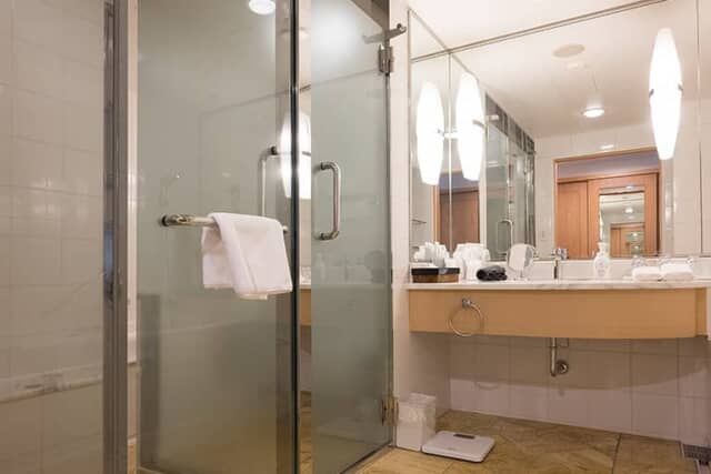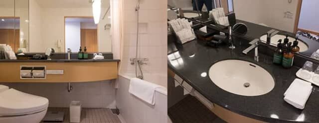 一般の客室はバス・トイレ・洗面が同じスペースにありますが、デラックスタイプとエグゼクティブタイプの客室はシャワーブースとバスタブがセパレートになっていて、複数で泊まっても使いやすくなっています。