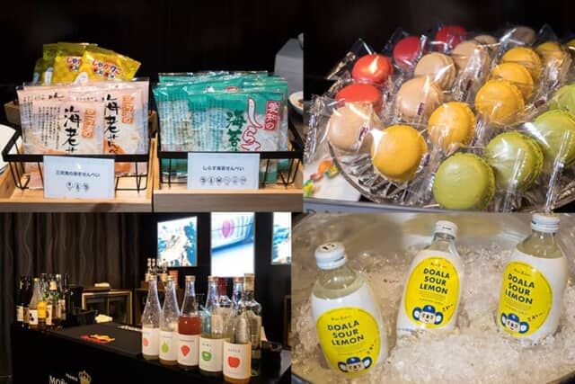 中日ドラゴンズ公認の「ドアラ サワー レモン」は注目。おつまみも愛知の「しらす海苔せんべい」や、三河地方の「海老せんべい」を用意するほか、なんと世界三大マカロンのひとつ、フランス「ダロワイヨ」のマカロンまであって驚きました。