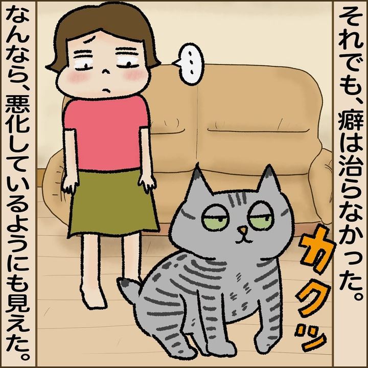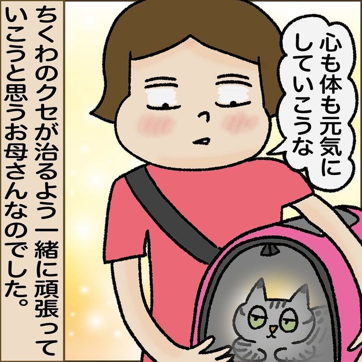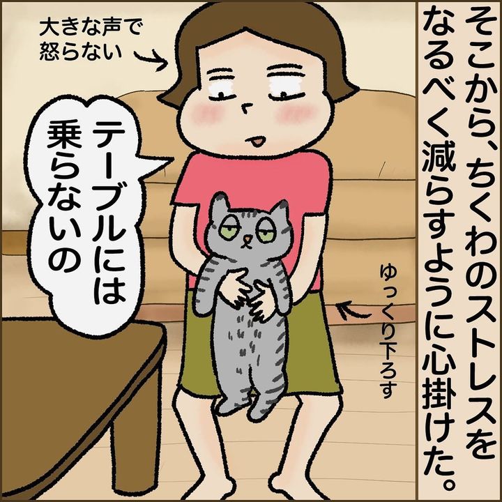 野良猫時代に何かあったのでしょうか?その影響で左腕を曲げる動作をしてしまうのは、可哀想ですよね。「心も体も元気にしていこうな」と声をかけるところに、忍者ママのやさしさが垣間見えます。