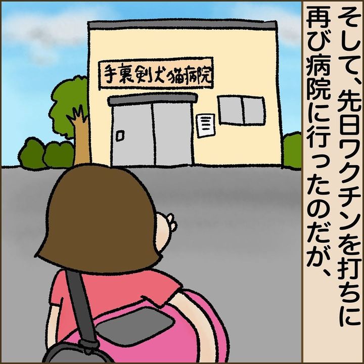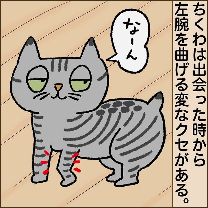 飼い猫のちくわは左腕を曲げるクセがあるそう。動物病院へ連れていくと、「心の問題」と診断されます。その後もクセは治らず、曲げた状態で関節が固定されてきてしまっているのでした。