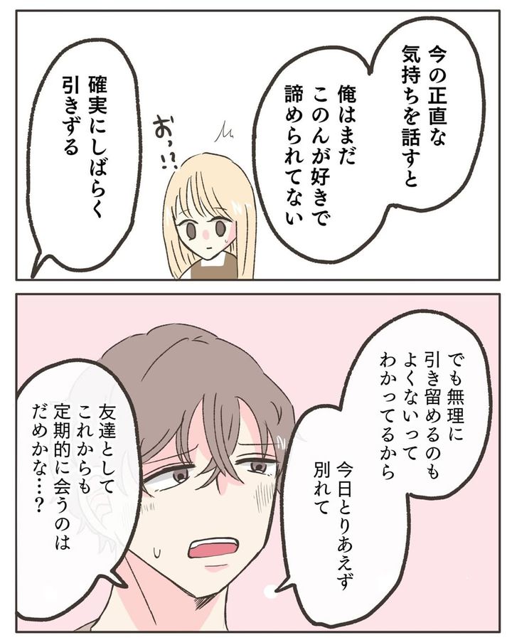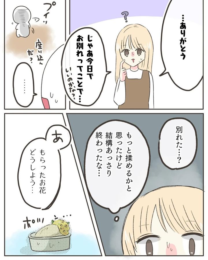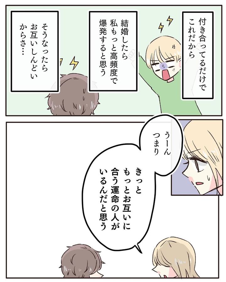彼氏のミヤさんに対して、別れ話を切り出した野花このんさん。友達として定期的に会いたいと、ミヤさんは難色を示しますが、「きっともっとお互いに合う運命の人がいるんだと思う」と、前向きな別れを望む野花このんさんなのでした。