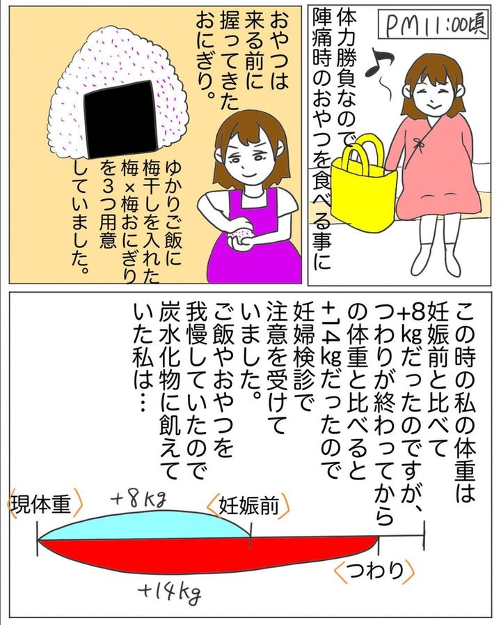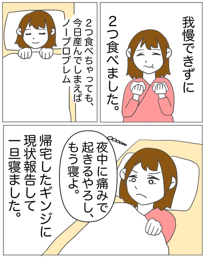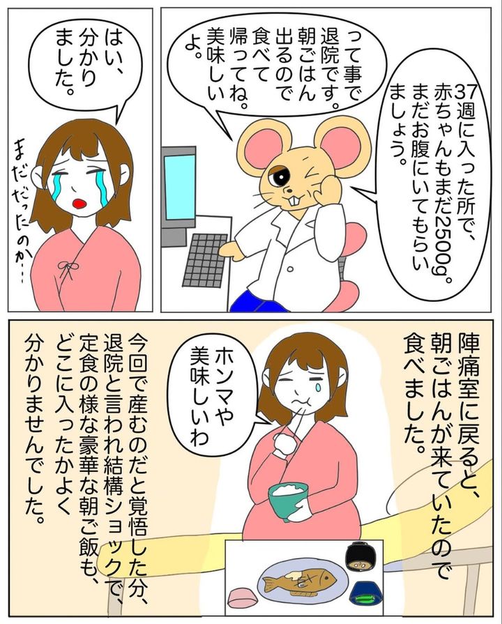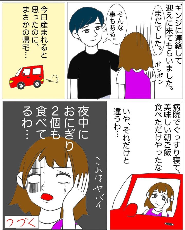 出産の心構えをして病院へ向かったことを考えると、退院と言われたショックは大きかったことでしょう。夜中におにぎりを2個食べたことを後悔する、シオリさんの青ざめた表情が印象的です。
