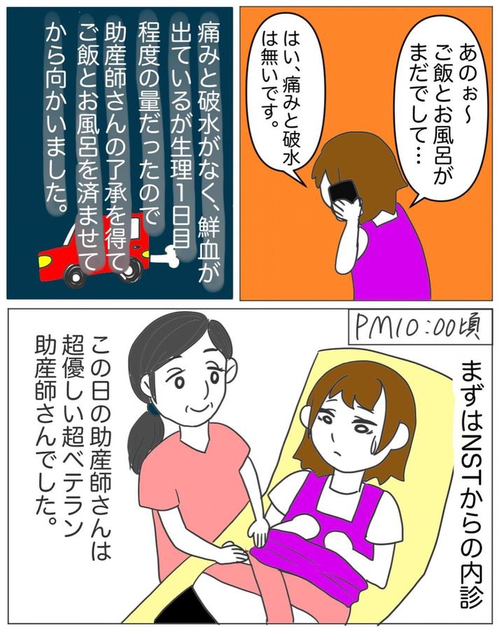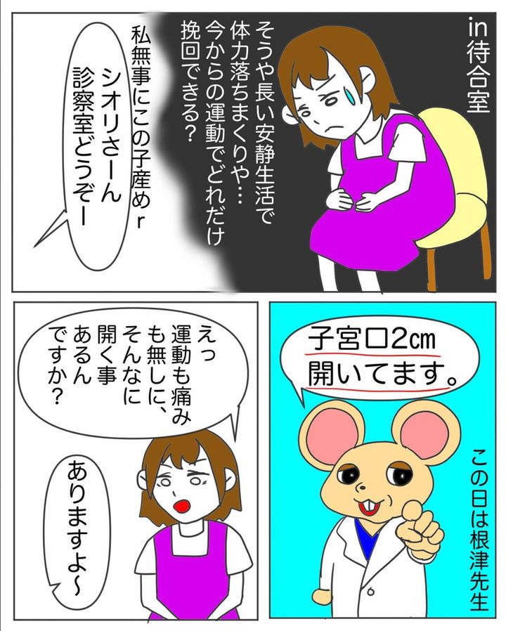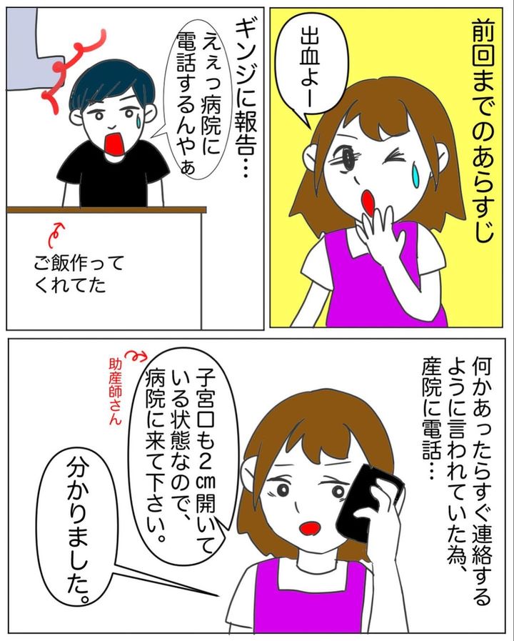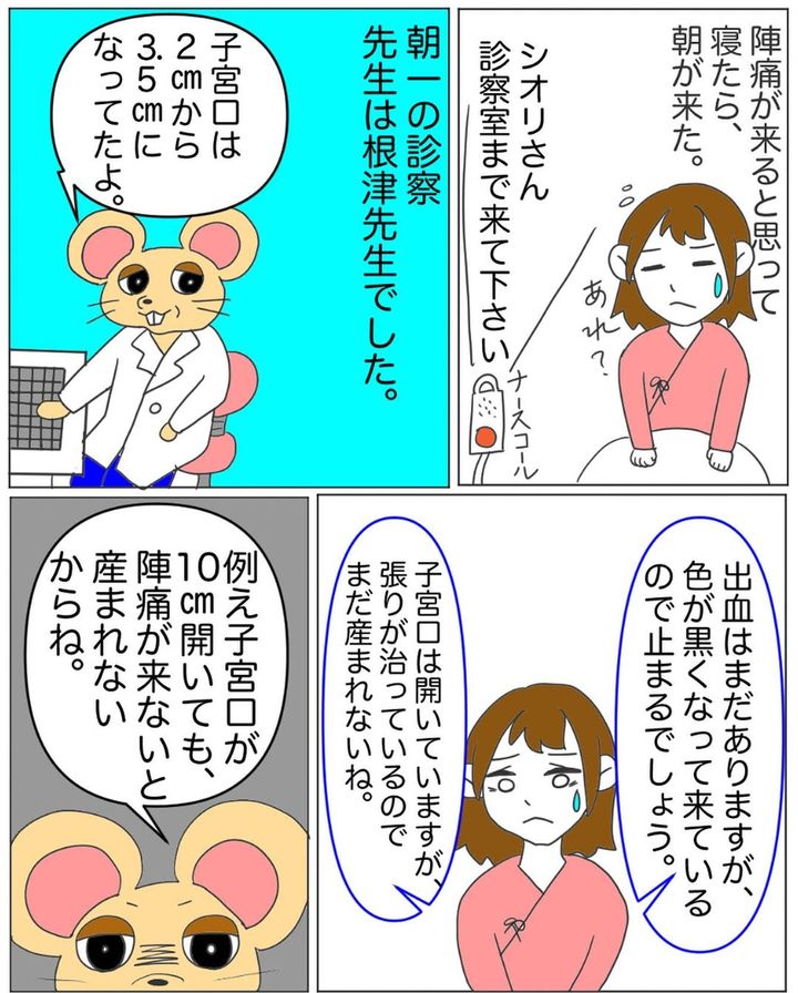 子宮口が開き始めたシオリさん。出血があったため病院へ向かいます。そのまま出産かと思われましたが、一晩寝た結果、ひとまず退院するよう指示されるのでした。