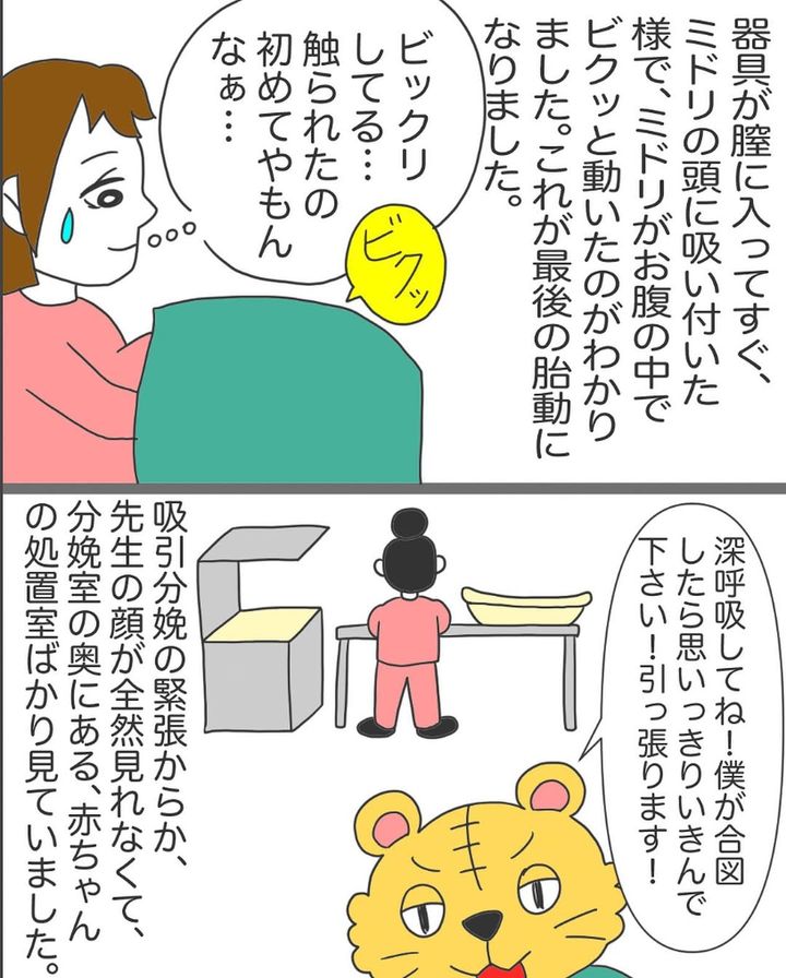 必死にいきむシオリさんの、赤鬼のごとき描写が印象的です。出産はまさに戦い。吸引分娩によって、無事にミドリくんを出産できて、本当に安心しました。
