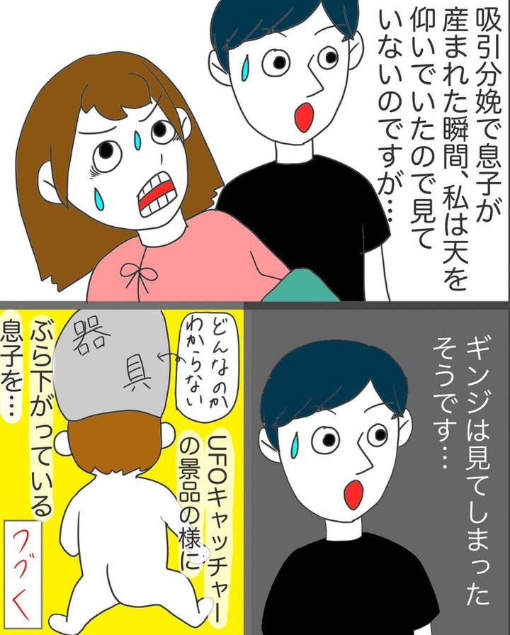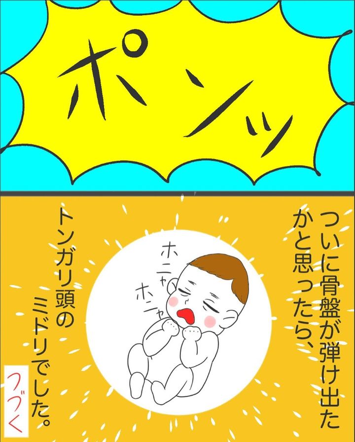 子宮低圧迫法を行った後、会陰を切開し、吸引分娩に移行します。吸引によって骨盤が弾け出たかと思うと、それはミドリくんだったのでした。