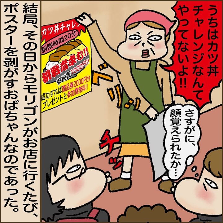 大盛りカツ丼チャレンジに成功したモリゴン。数日後、もう一度チャレンジし、またしても完食。それ以来、モリゴンがお店に行くと、カツ丼チャレンジのポスターを剥がされてしまうのでした。