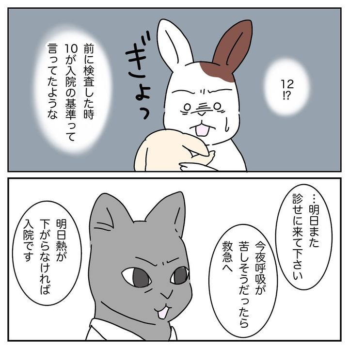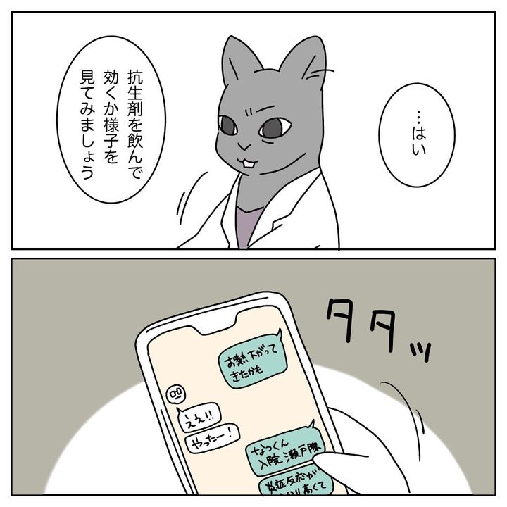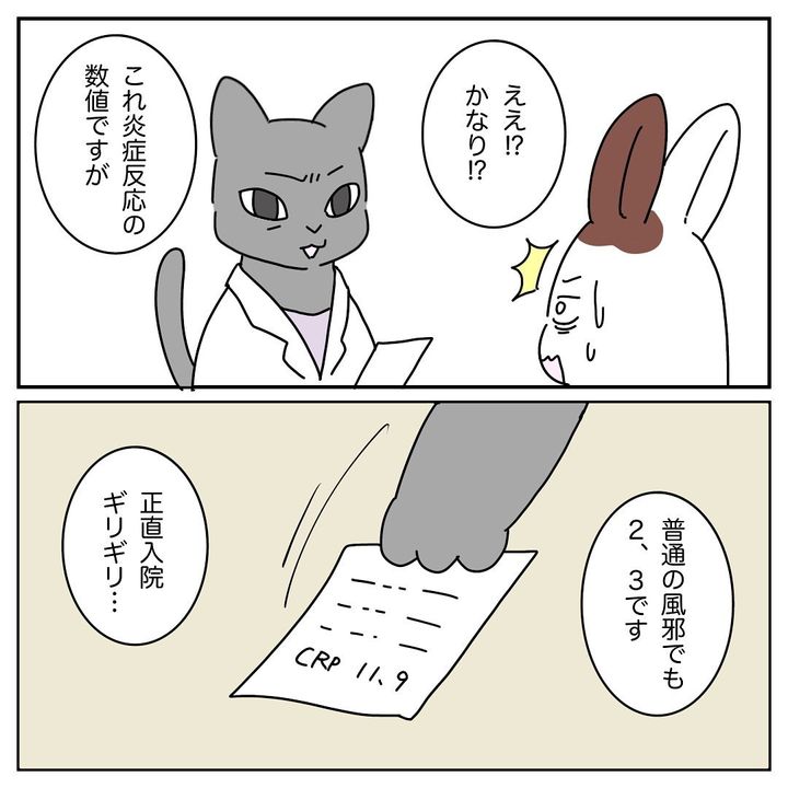 はる子さんは、「CRPとは炎症反応示すものらしく12近いけど入院しなくて大丈夫なんですか?と聞いてみたところ10はひとつの基準ではあるけど全身状態を見て判断してます、とのことでした」とコメント。なつ君の回復を願うばかりです。