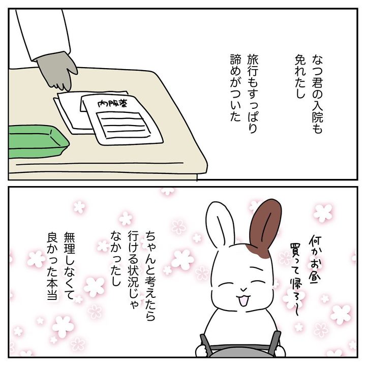 はる子さんは、「検査の結果、すごく良くなったわけではなかったけど入院は回避できたなつ君 明日も受診して下さい、と言われて ああ無理やり行かなくて良かった 沖縄もキッパリ諦められた とホッとした」とコメント。はる子さんの決断力に感心しました!