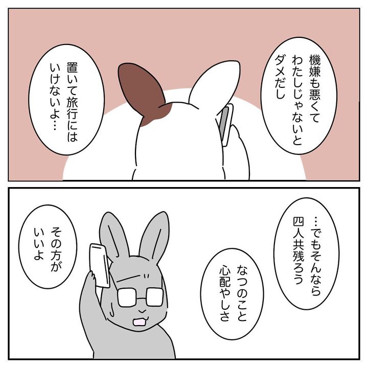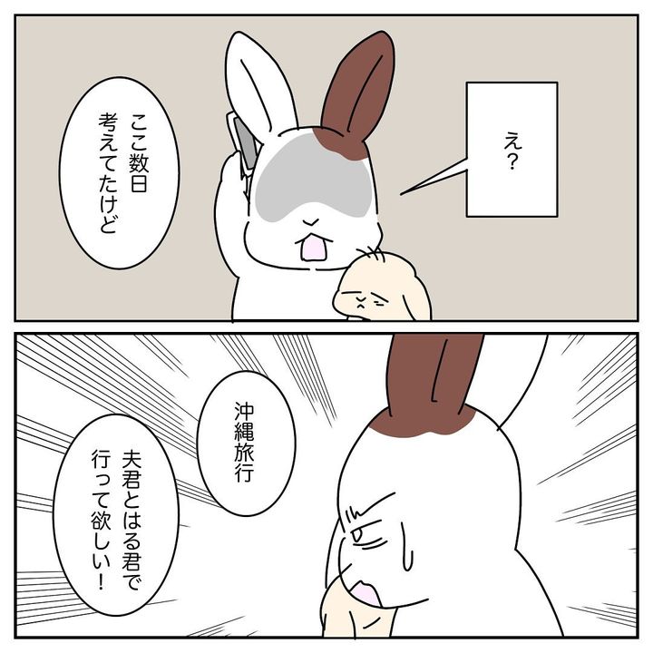 なつ君の熱が下がらないため、沖縄旅行には夫さんとはる君の2人で行ってきてほしいと提案するはる子さん。二泊三日の旅行中、夫さんがはる君の面倒を見られるのか心配するのでした。